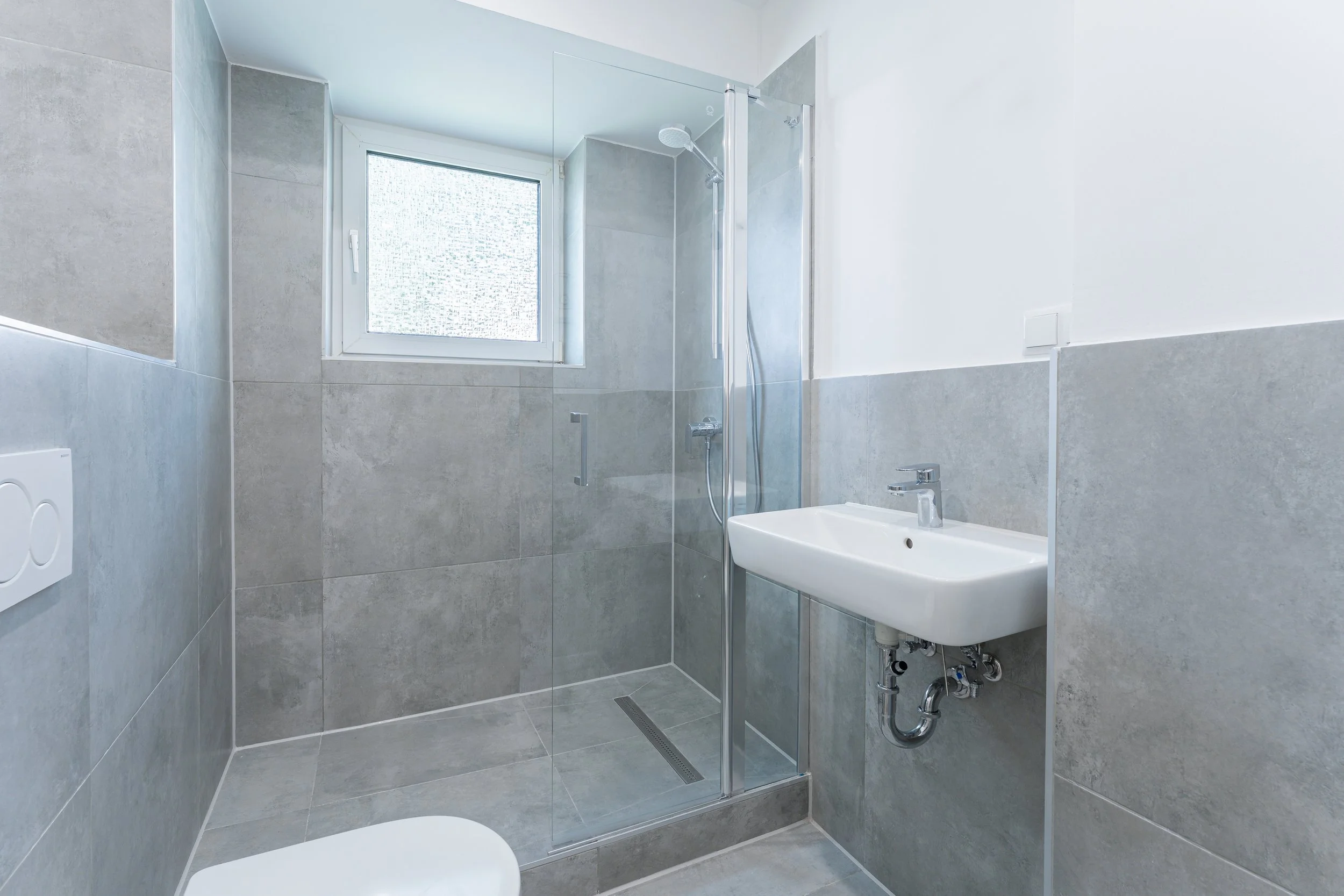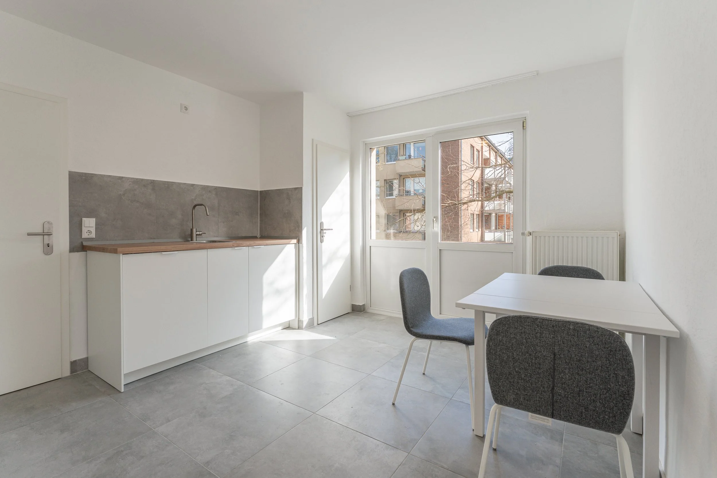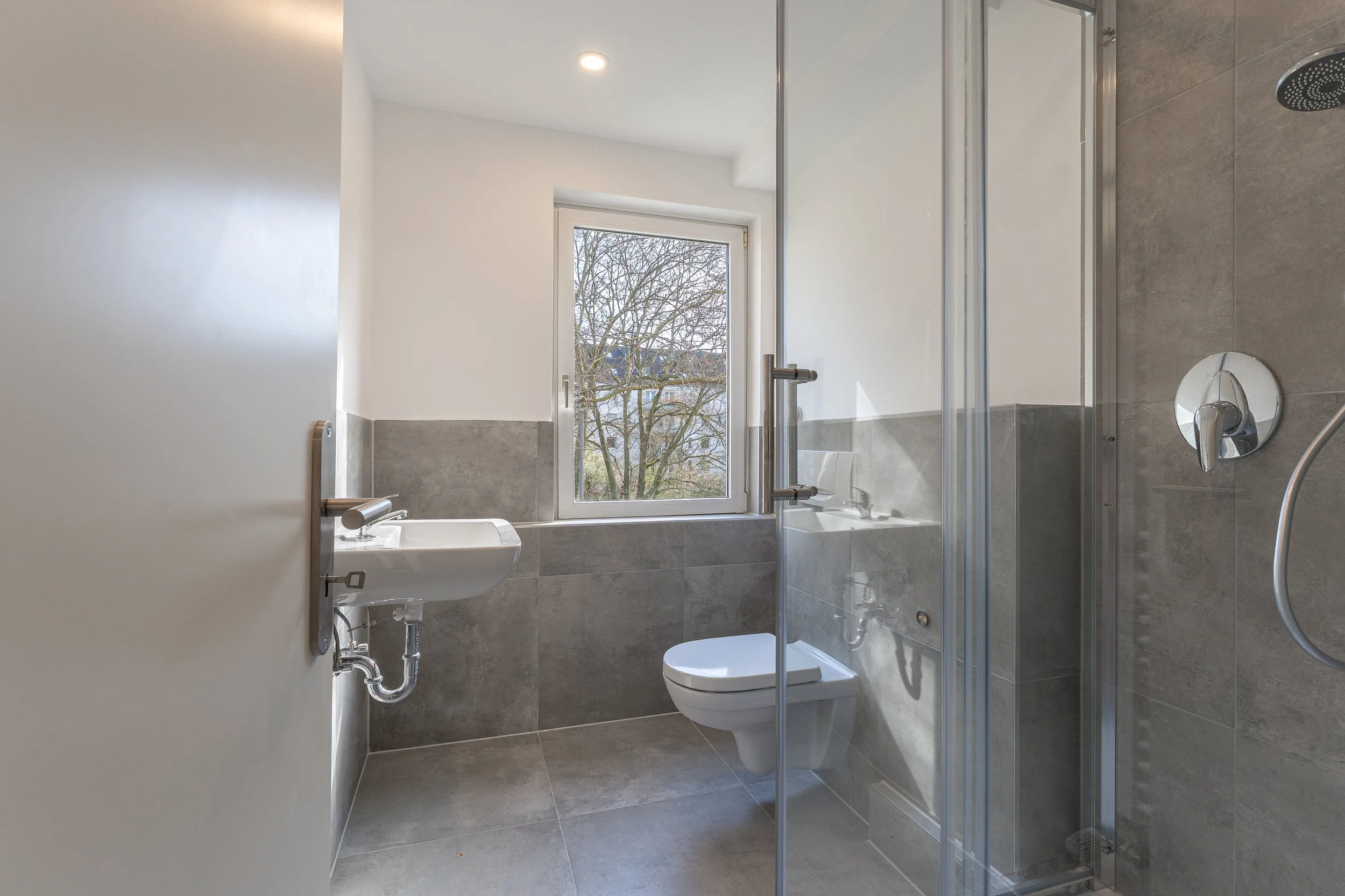 In den gemeinschaftlich genutzten Flächen – Küche und Flur sowie unseren frisch sanierten Bädern – sorgen große, moderne Fliesen, für ein pflegeleichtes Gesamtbild. Die Decken sind abgehangen und mit integrierten LED-Spots versehen, wodurch ihr noch mehr Lichtverteilung in den Räumen habt und euch nicht um Lampen kümmern müsst.