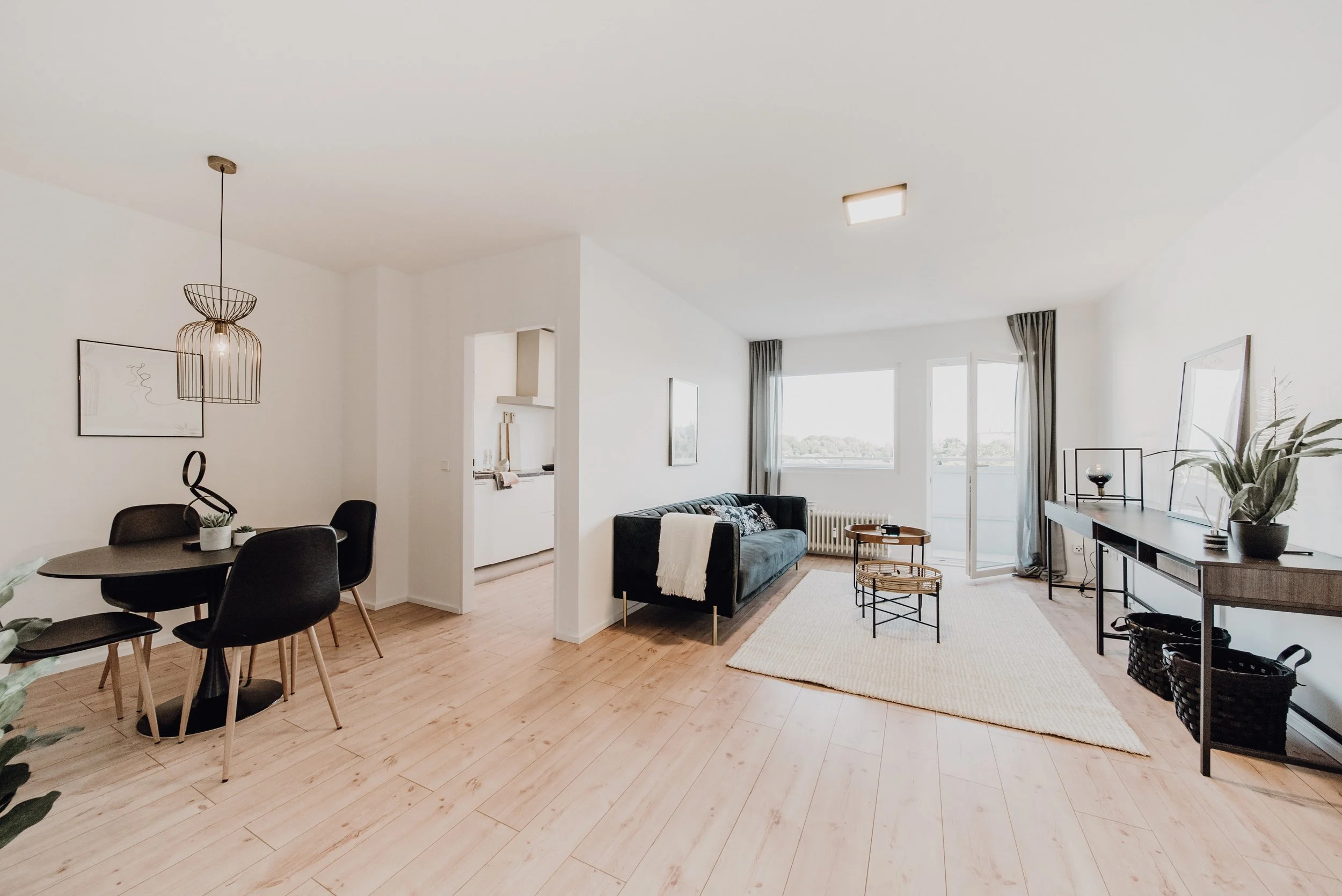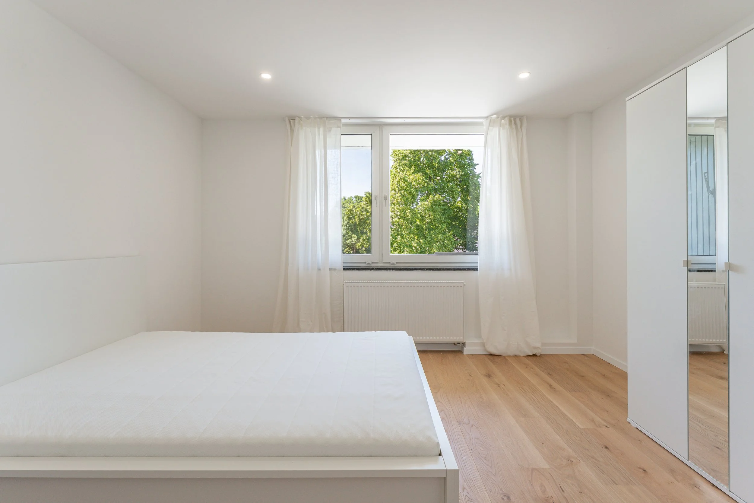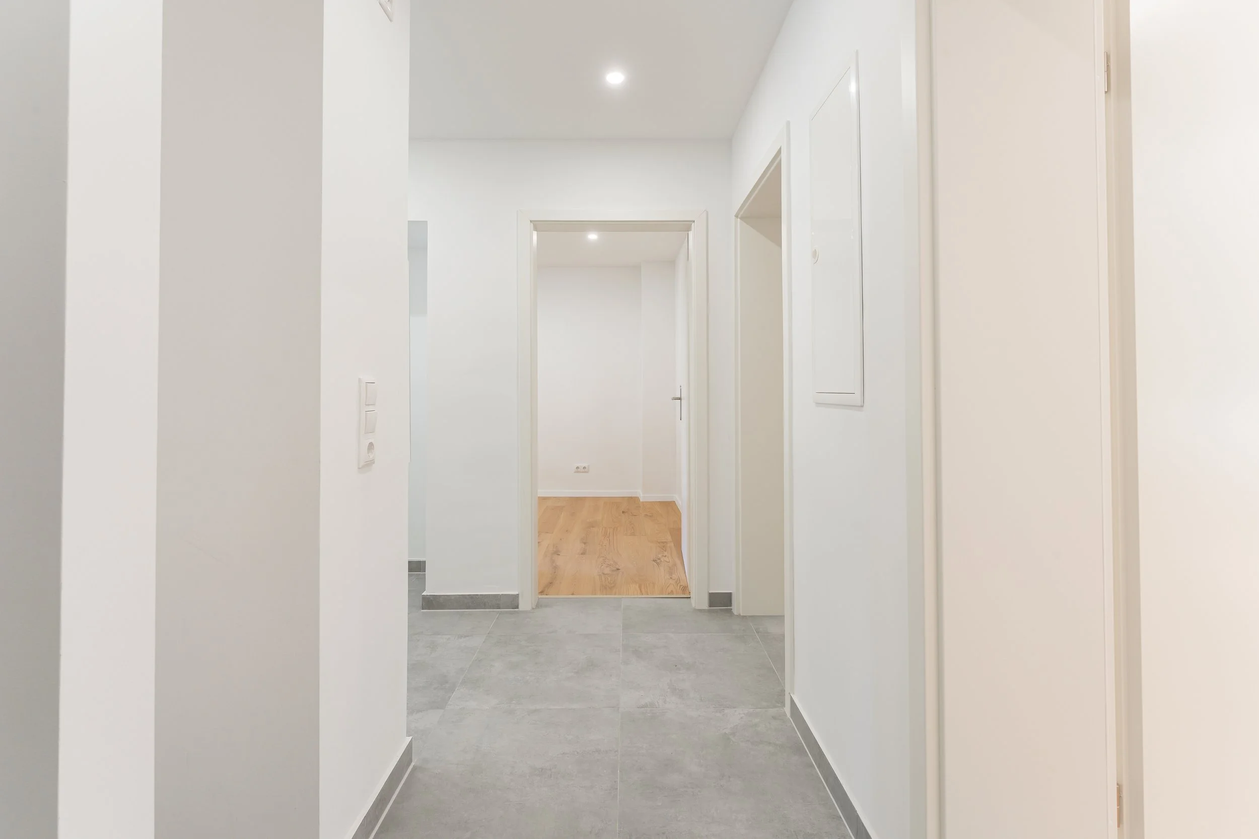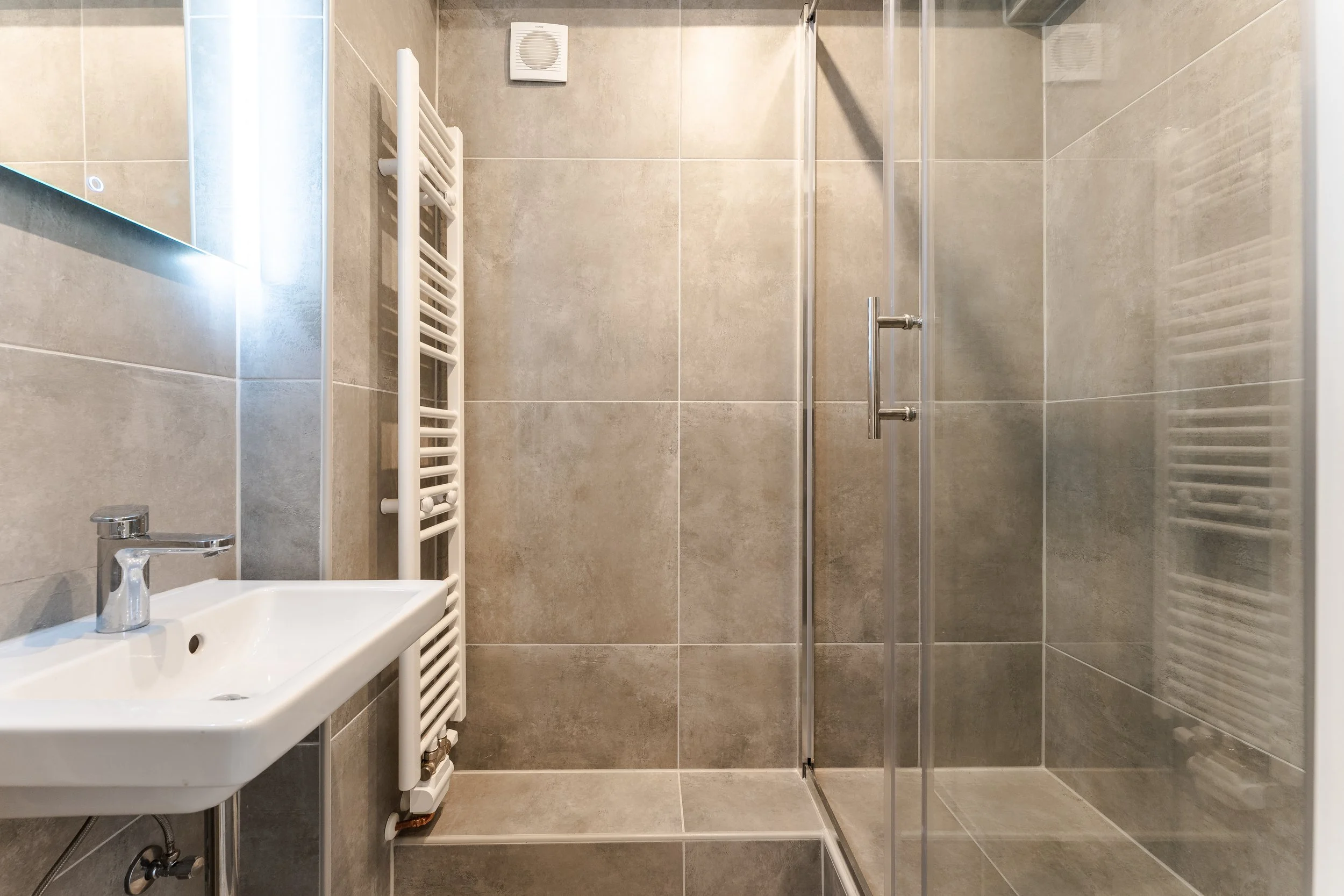 In den gemeinschaftlich genutzten Flächen – Küche und Flur sowie unseren frisch sanierten Bädern – sorgen große, moderne Fliesen, für ein pflegeleichtes Gesamtbild. Die Decken sind abgehangen und mit integrierten LED-Spots versehen, wodurch ihr noch mehr Lichtverteilung in den Räumen habt und euch nicht um Lampen kümmern müsst.