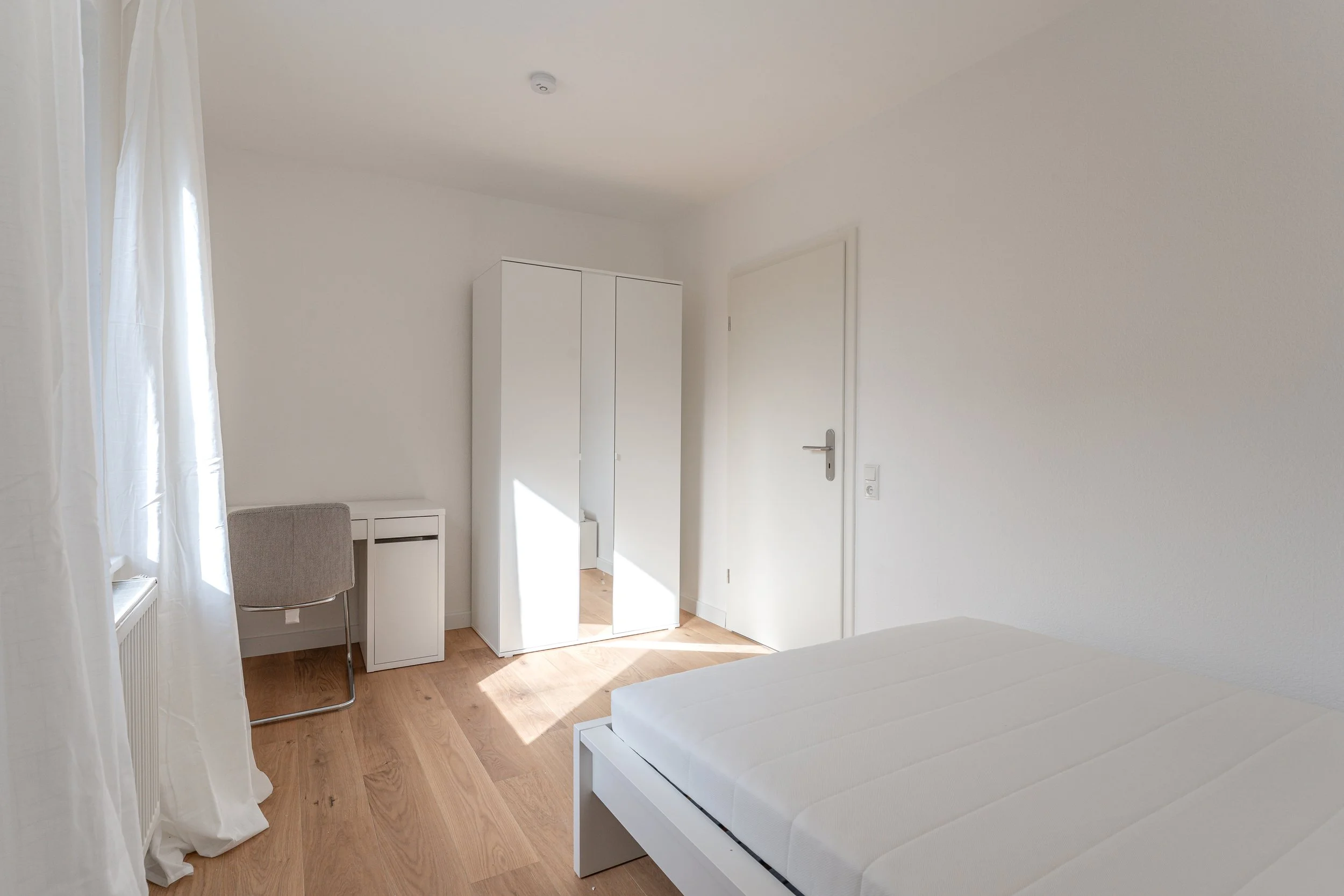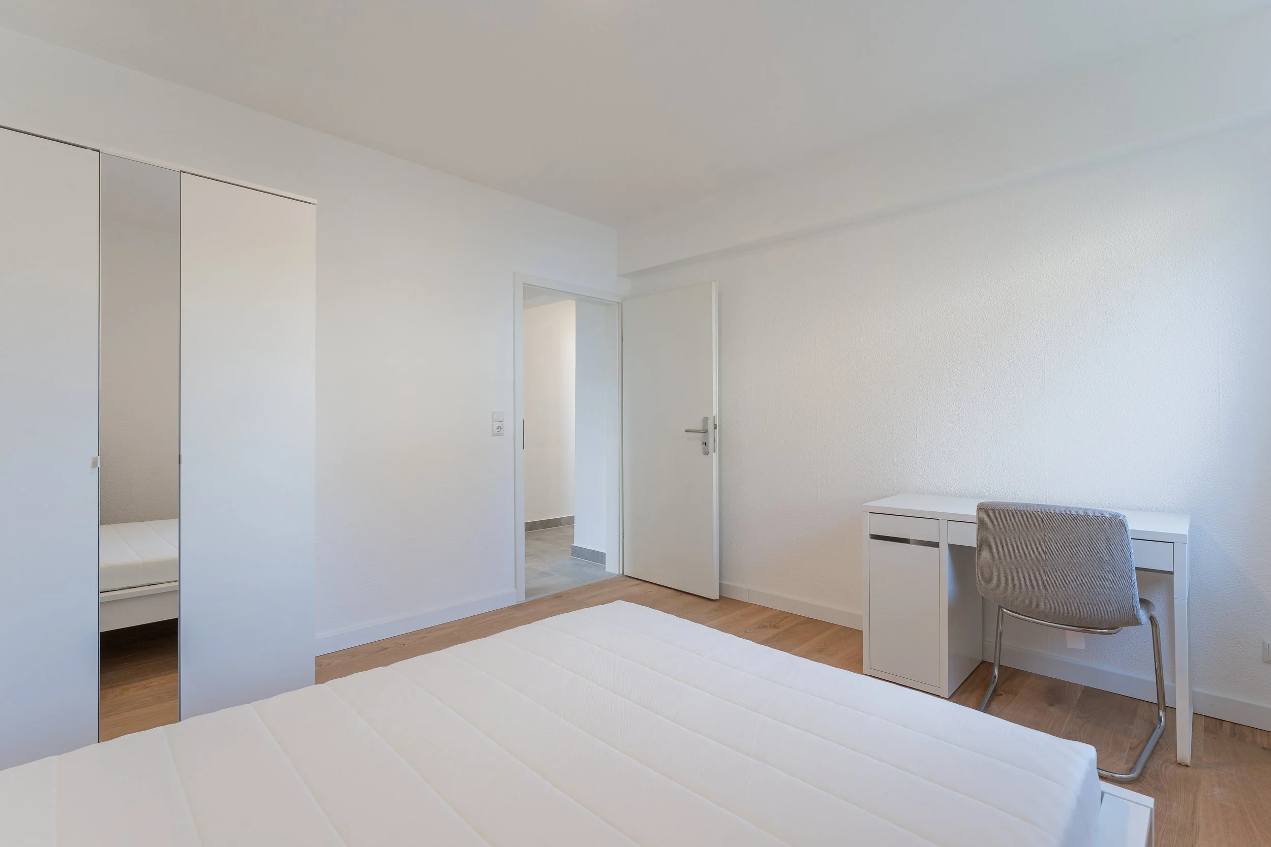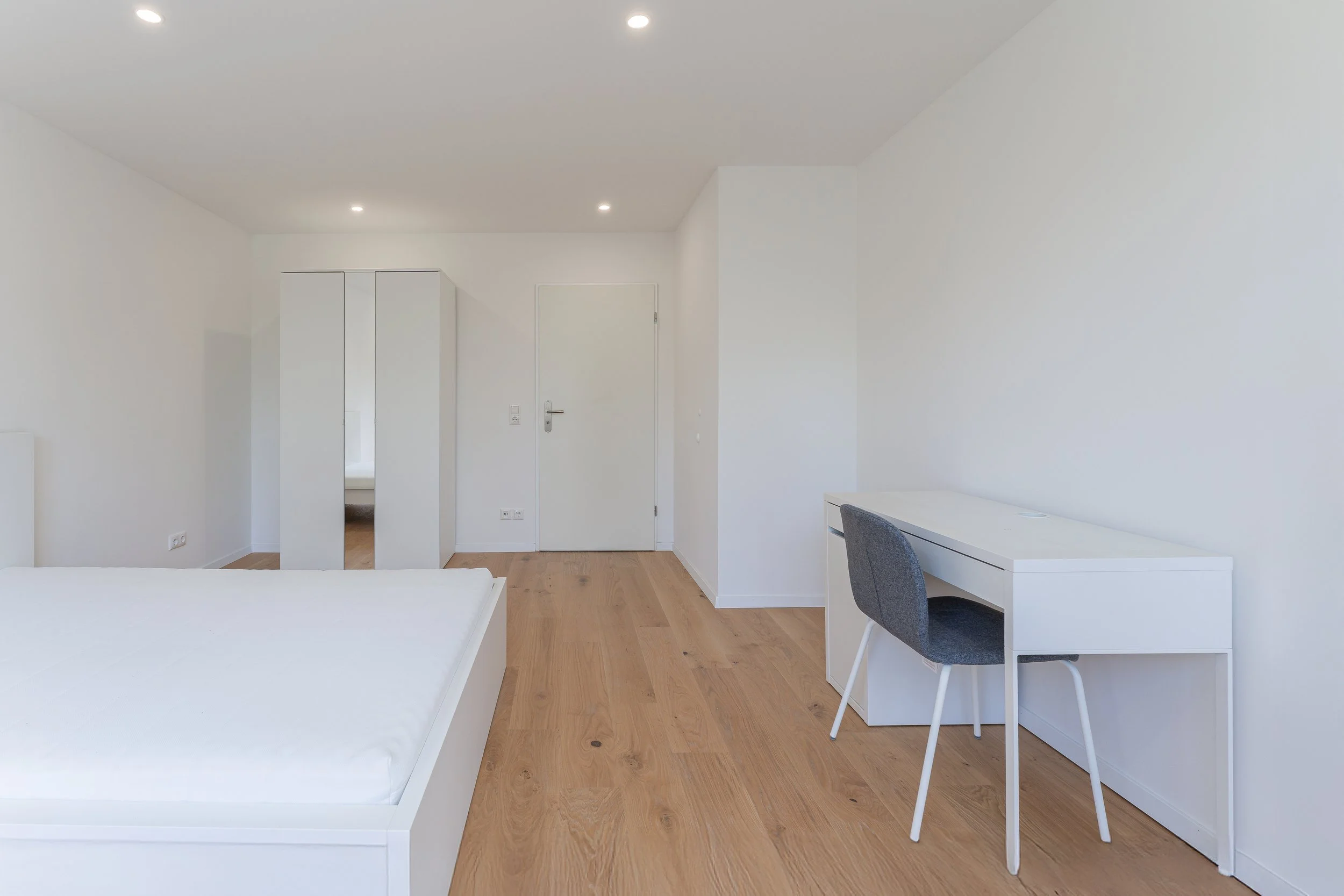 Die Wohnräume sind für eine warme und gemütliche Atmosphäre mit Echtholzparkett und jeweils einem Bett, Schreibtisch, Schreibtischstuhl und ein Kleiderschrank ausgestattet. Des Weiteren erwarten euch in den Zimmern Dinge wie Schreibtischlampen, Vorhänge, zusätzlicher Stauraum und einiges mehr. Die Zimmer können nach Belieben durch eure persönlichen Gegenstände erweitert werden.