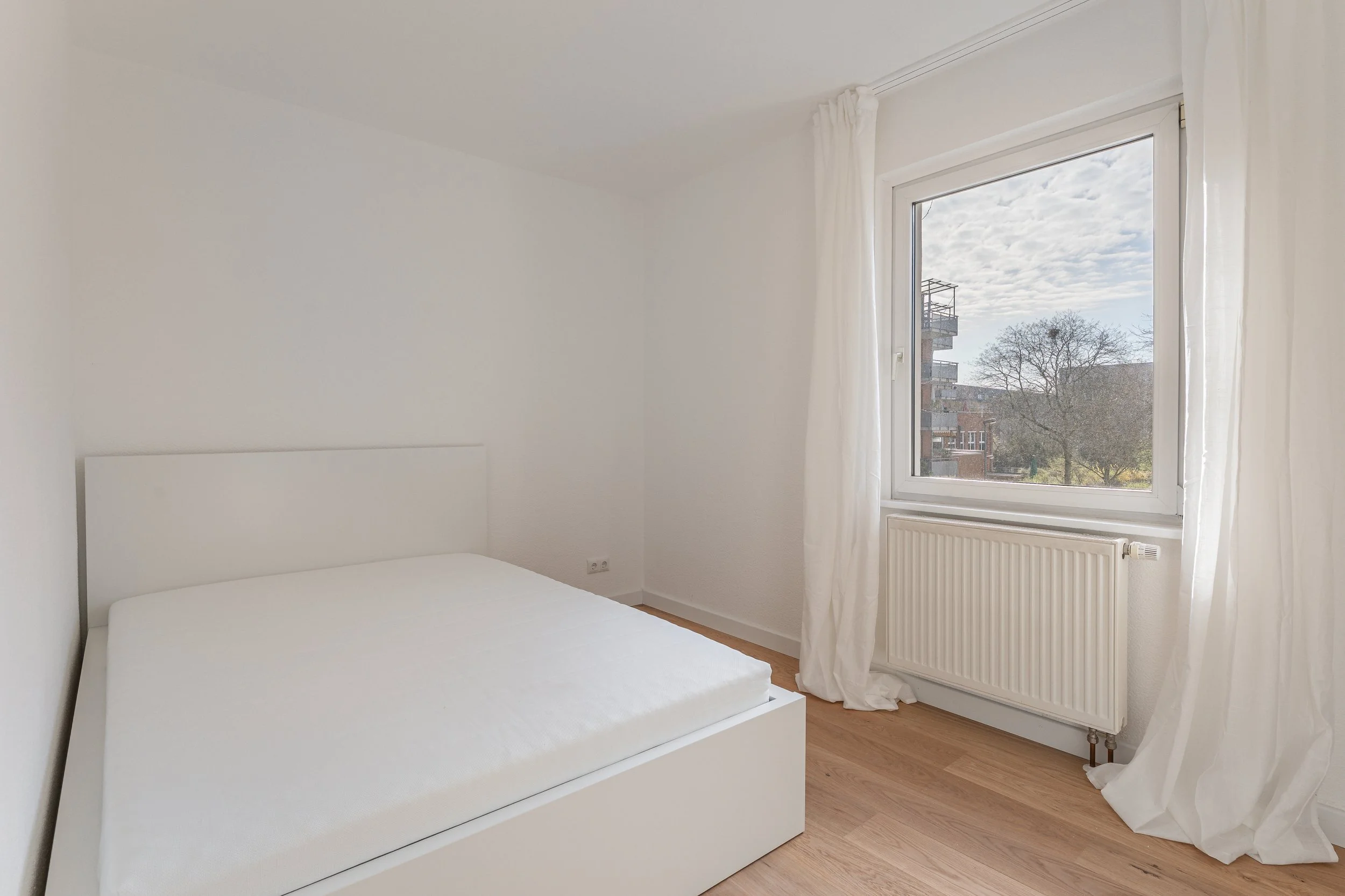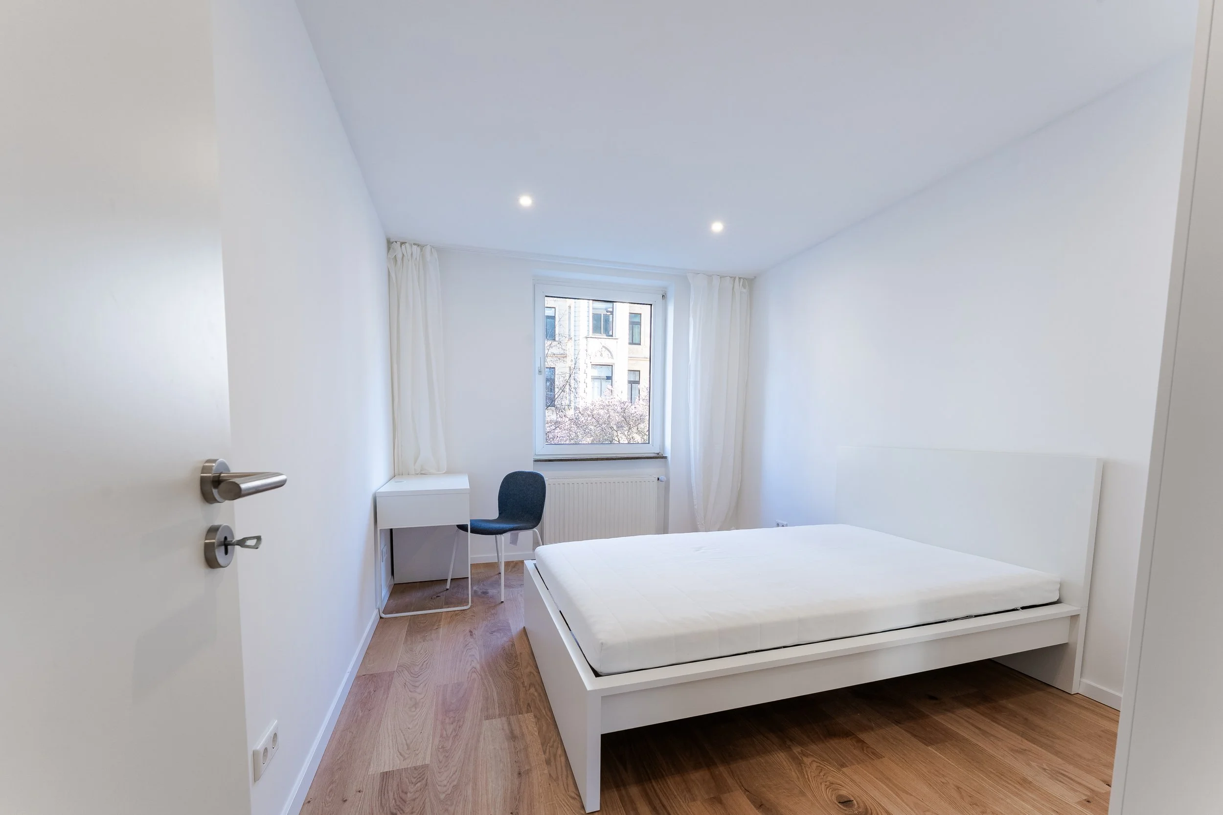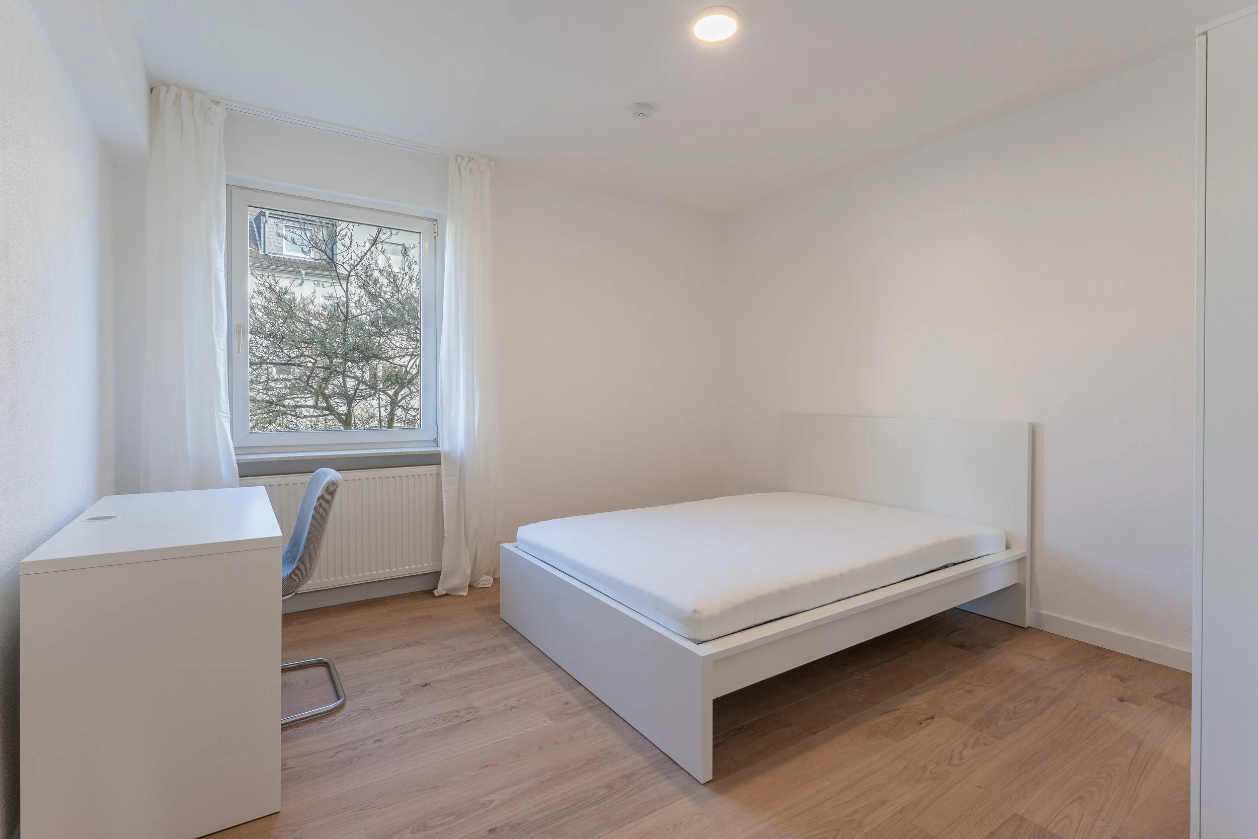 Die Wohnräume sind für eine warme und gemütliche Atmosphäre mit Echtholzparkett und jeweils einem Bett, Schreibtisch, Schreibtischstuhl und ein Kleiderschrank ausgestattet. Des Weiteren erwarten euch in den Zimmern Dinge wie Schreibtischlampen, Vorhänge, zusätzlicher Stauraum und einiges mehr. Die Zimmer können nach Belieben durch eure persönlichen Gegenstände erweitert werden.